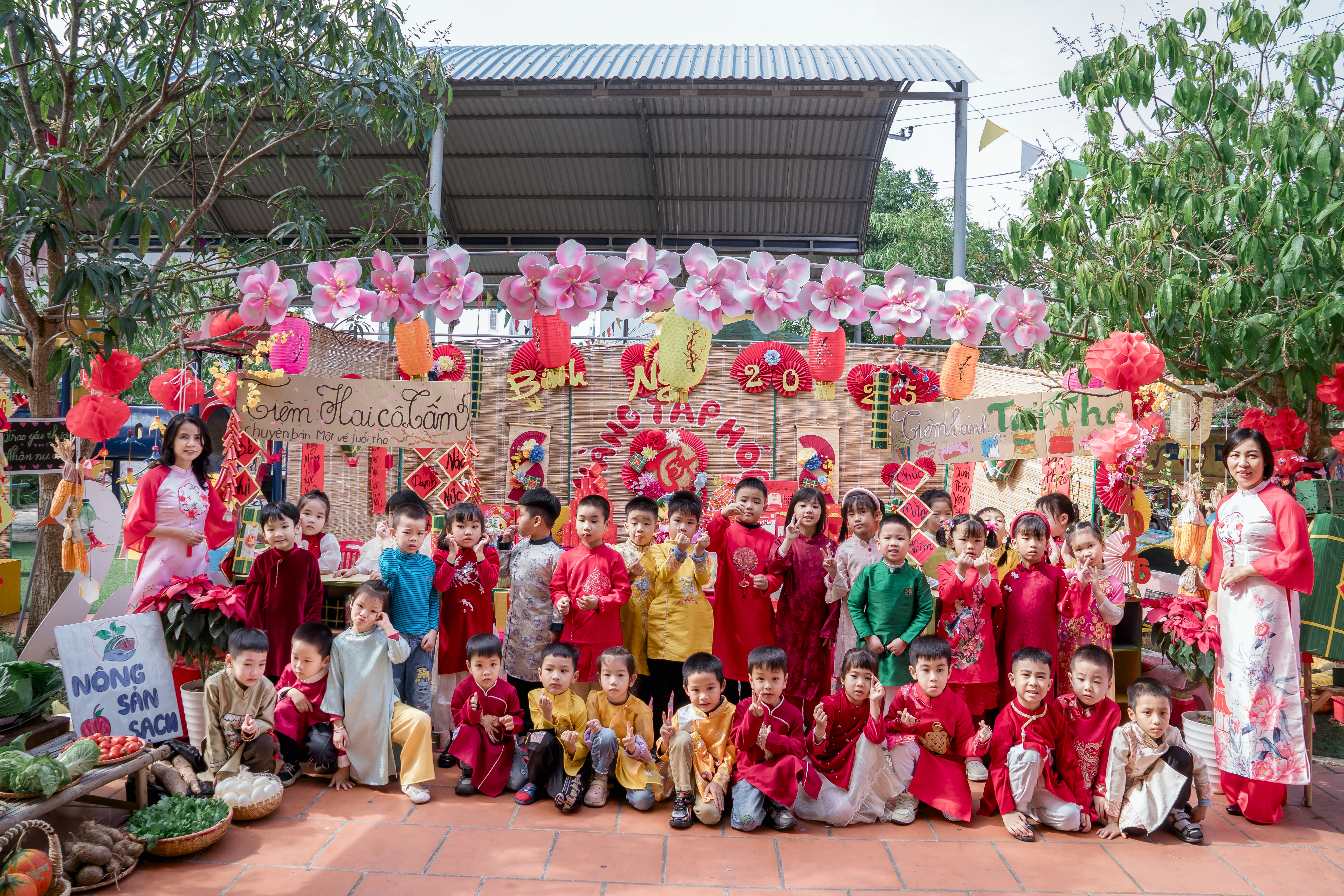 Ngay từ sớm, không gian nhà trường đã ngập tràn sắc xuân với đào, mai, câu đối đỏ, đèn lồng và những tiểu cảnh Tết được trang trí công phu. Mỗi lớp học là một góc xuân riêng biệt, thể hiện sự sáng tạo và tâm huyết của giáo viên cùng sự háo hức, hồn nhiên của các em nhỏ. Tiếng cười nói ríu rít hòa cùng sắc màu tươi thắm khiến sân trường như bừng sáng hơn trong những ngày cuối năm.