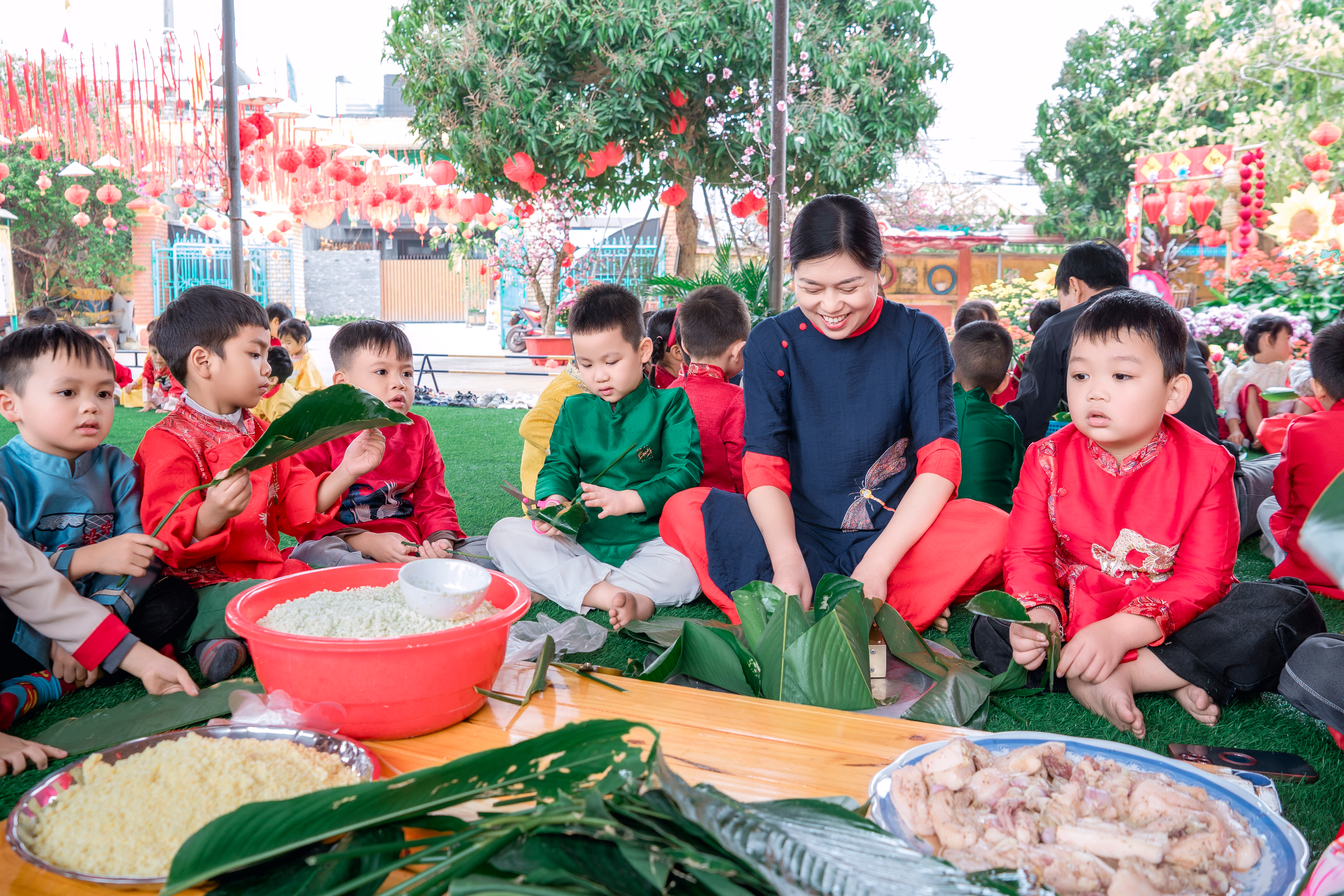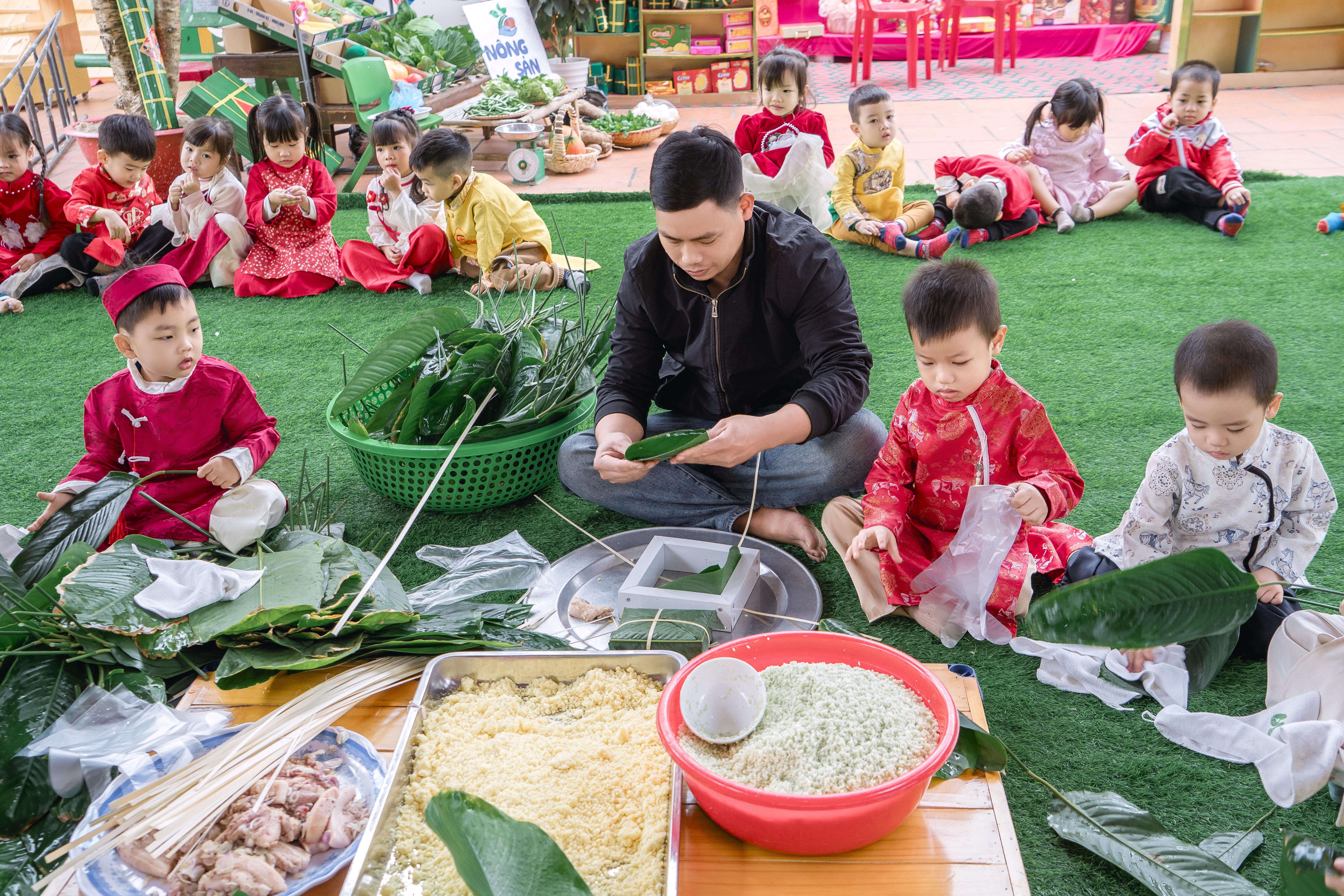Điểm nhấn nổi bật của chương trình là “Ngày hội Bánh chưng xanh” – nơi truyền thống dân tộc được tái hiện sinh động qua từng hoạt động trải nghiệm. Các bé được tận tay sờ lá dong, vo gạo nếp, xem cô hướng dẫn gói bánh, lắng nghe câu chuyện về sự tích bánh chưng, bánh dày. Những đôi bàn tay nhỏ xíu vụng về nhưng đầy cố gắng đã tạo nên những chiếc bánh mang theo bao niềm vui và sự tự hào. Qua đó, các em không chỉ hiểu thêm về Tết cổ truyền mà còn học được bài học về lòng biết ơn tổ tiên và giá trị của sự đoàn kết.